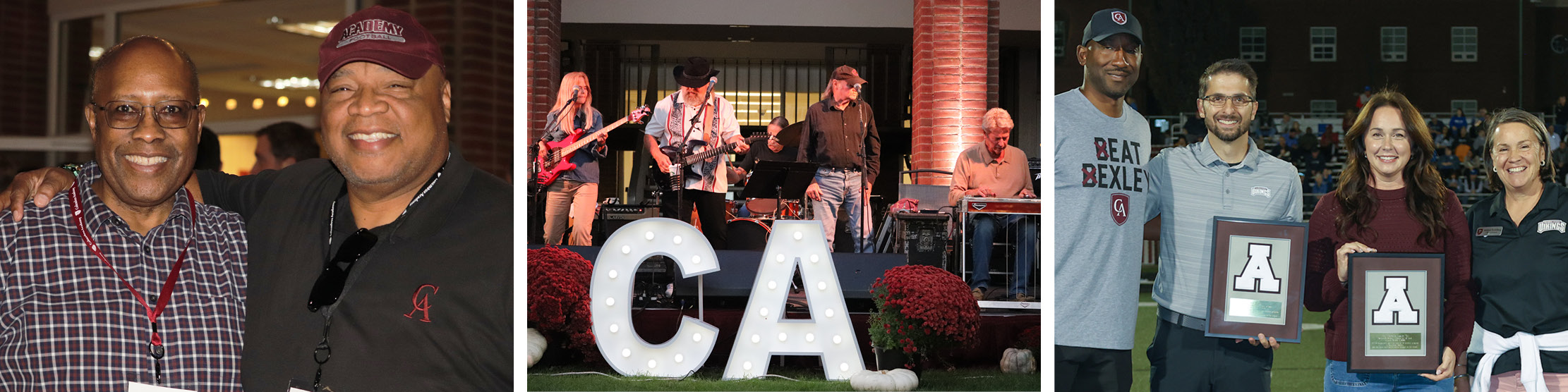 Meanwhile, the Academy Quad welcomed alumni from a wide range of classes for a special tailgate complete with a spread of food and drinks, all while a livestream of the football game was shown on multiple screens. Special this year was a private concert in the quad by local music group McGuffey Lane, adding a nice vibe to the scene as alumni caught up with fellow classmates and reconnected with faculty. Many alumni also made their way down to the field to watch the halftime recognition of our two newest Athletic Hall of Fame inductees Amy Marotta Lester ’04 and Dr. Ben Bring ’03.